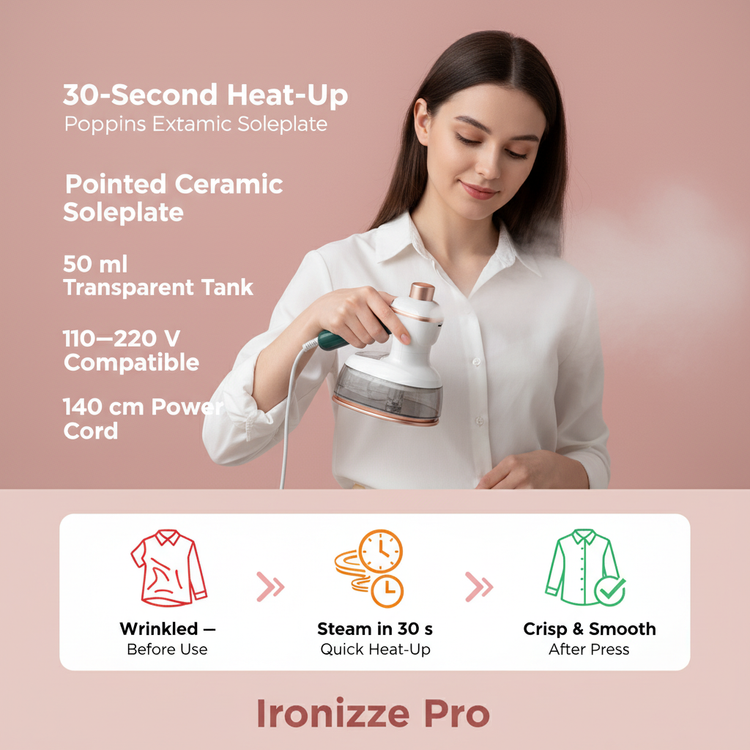 From business suits to evening wear, Ironizze Pro delivers smooth results wherever adventure takes you. Perfect for quick touch-ups in hotels or at home.